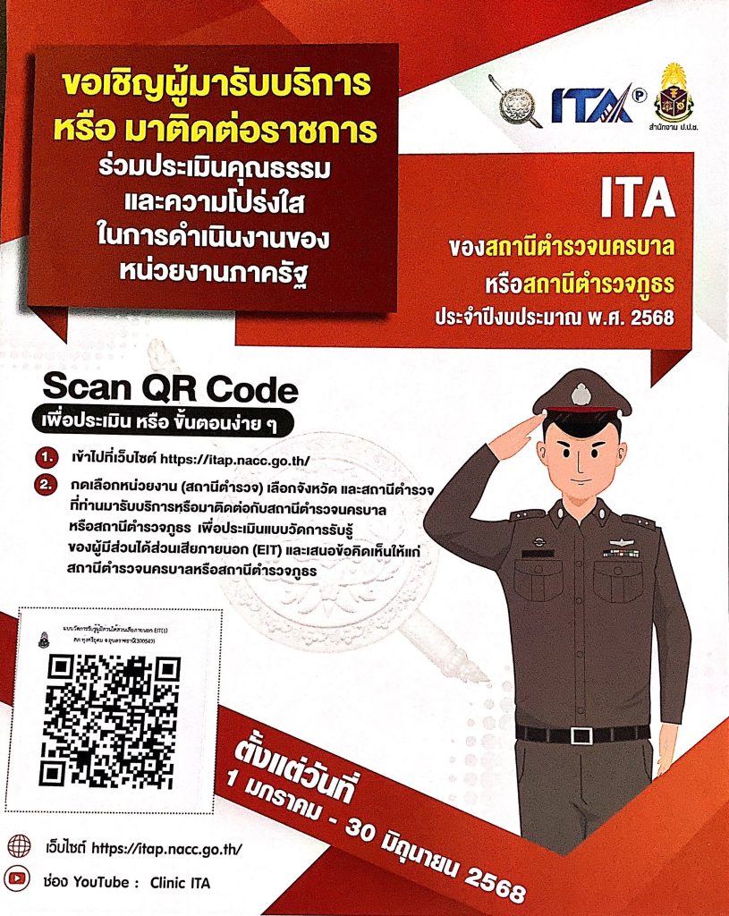 สถานีตำรวจภูธรทุ่งศรีอุดม จังหวัดอุบลราชธานี ขอเชิญชวนผู้มารับบริการ/มาติดต่อ สถานีตำรวจ ร่วมจัดทำแบบการรับรู้ของผู้มีส่วนได้เสียภายนอก (Enternal Integrity Transparency Assesment : EIT) 2025 สำหรับนำไปพัฒนาปรับปรุงการให้บริการของสถานีตำรวจ โดยการสแกน QR Code ซึ่งได้ประชาสัมพันธ์ไว้ที่หน้าเว็บไซต์หลักของ สภ. https://thungsiudom.ubonratchathani.police.go.th/